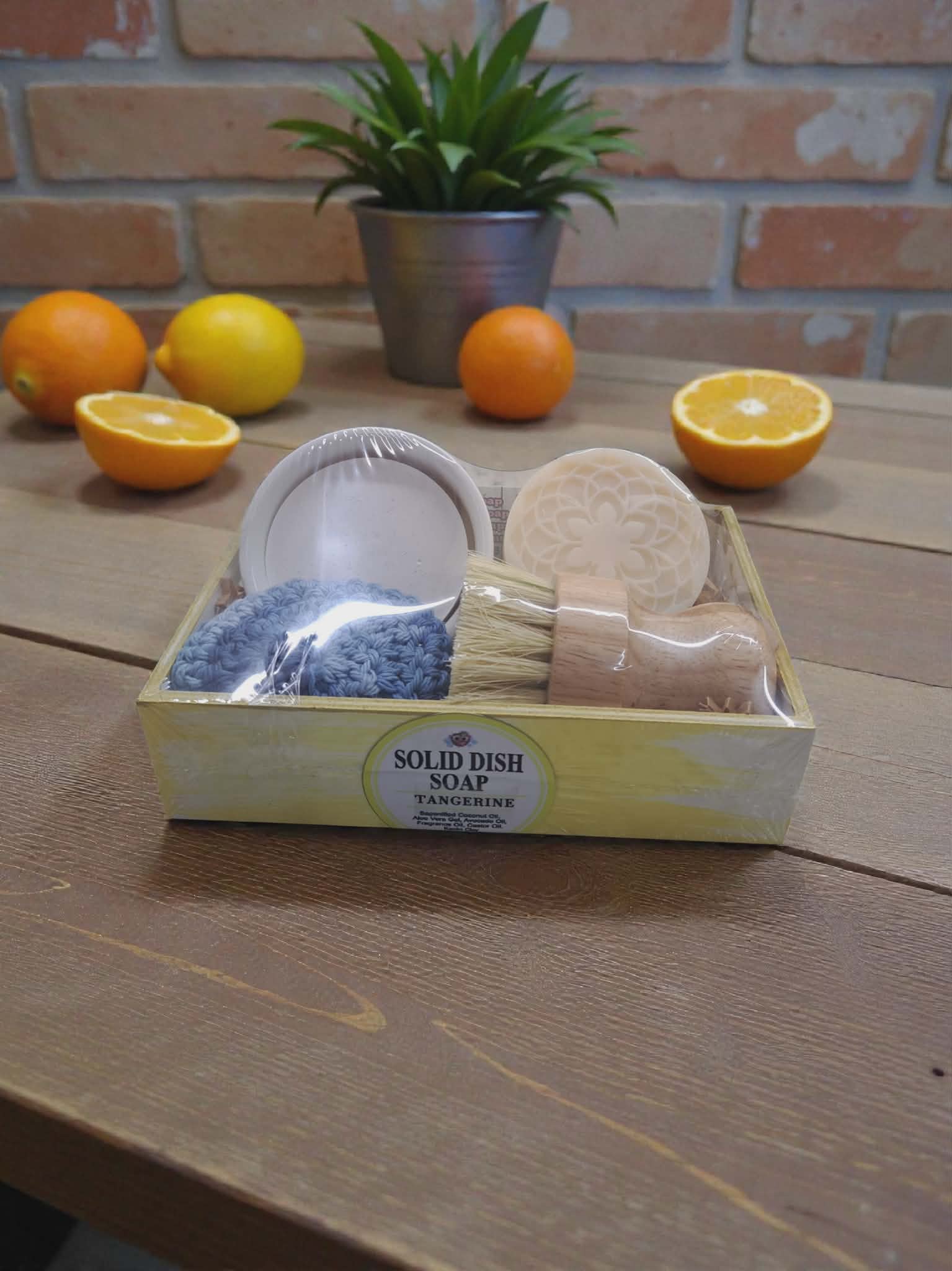 Solid Dish Soap Trays- These trays make great gifts! In each wooden tray it has a solid dish soap in a white dish with a scrubby, a dish brush, and a refill. You may ls order refills.